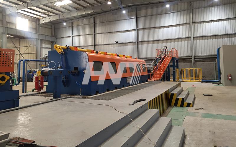 2. The production line is composed of the melting furnace, holding furnaces, four-wheel continuous casting machine, straightening machine, front traction, rolling shear machine, medium-frequency heating furnace, feeding machine, continuous mill machine, cooling system, take-up rod device, and electrical control system.